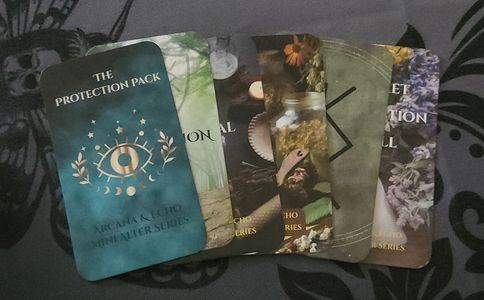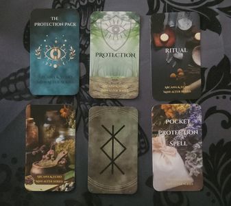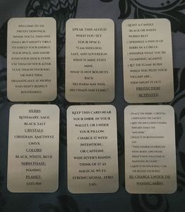 -Protection card set (2' x 3.5'). 6 pocket sized grimoire cards with ritual instructions and a rune of protection.